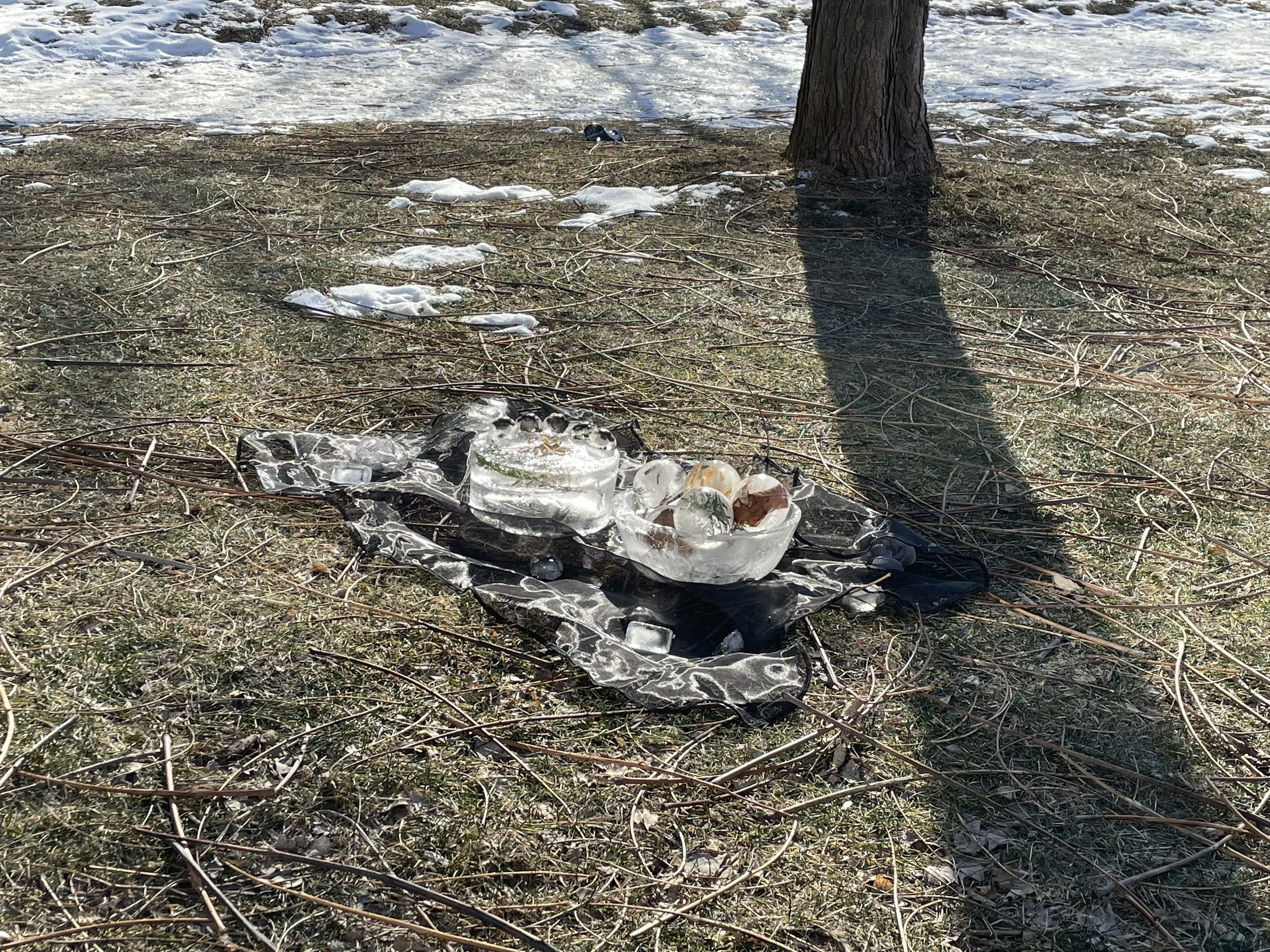 I set the impermanence picnic in McCaul-Orde Park, which was the place where I used to meet up with my friends in the old days. I used ice and collected plants to make the food in a picnic scene, imagining my friends and having a picnic in the park for the following spring with my sincere wishes that the pandemic could end soon.