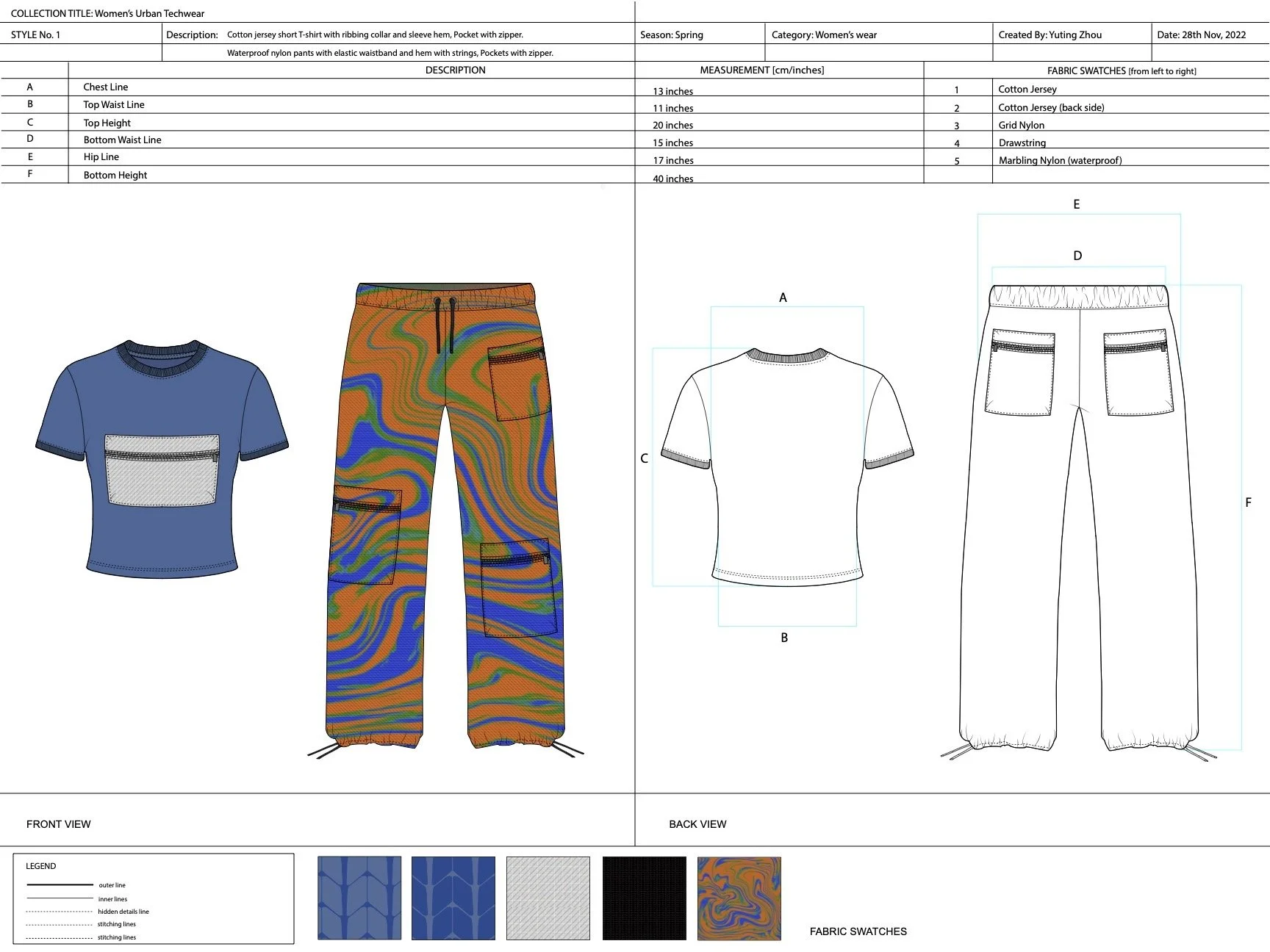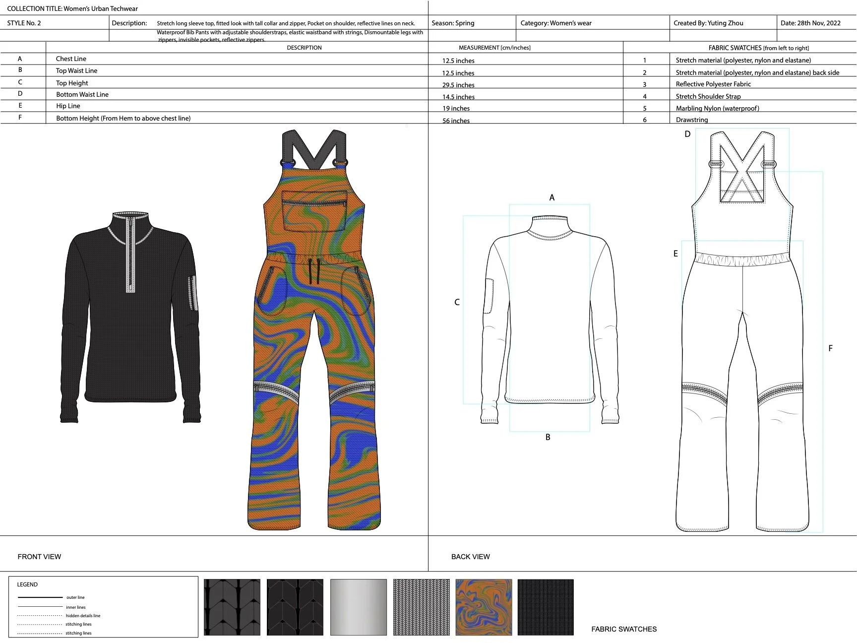 My collection is designed for women, urban-tech wear, which combines fashion and practicability. This collection consists of one mid-length dress, one skirt with a dismountable part, one pair of bib pants with dismountable legs, one shell jacket with dismountable arms, two pairs of pants, and three tops. The primary material of this collection is nylon and cotton; some clothes, like the bib pants and shell jacket, were designed in waterproof nylon fabric, which can fit more weather and environment. The technical brand Arcteryx and Burton's silhouette inspired my collection. I added the elements and storage places like zippers and pockets to make the technical wear more stylish.